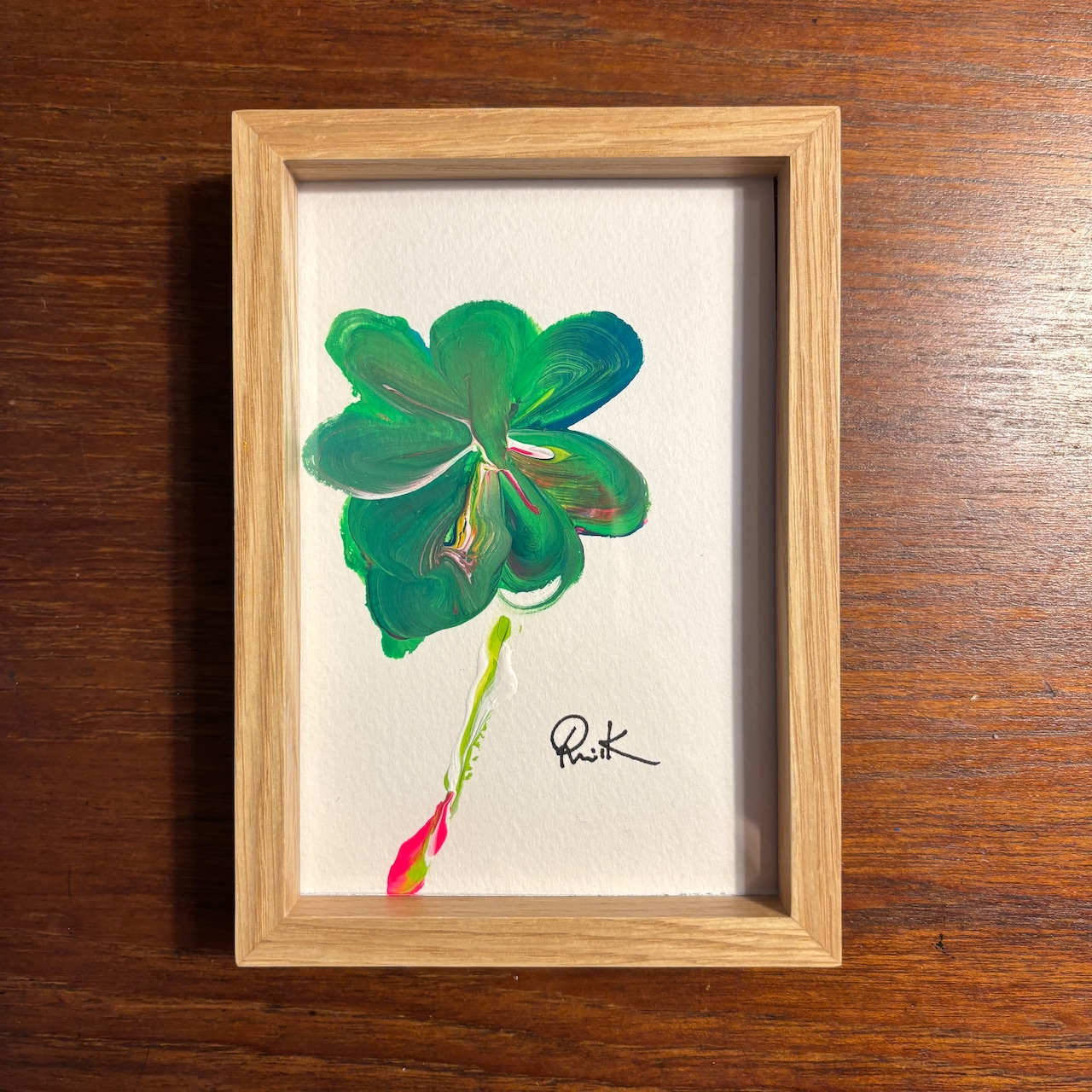 アクリル+オーク材で構成されたフレームで、壁掛けはもちろんそのままチェストなどに置くこともできます。
